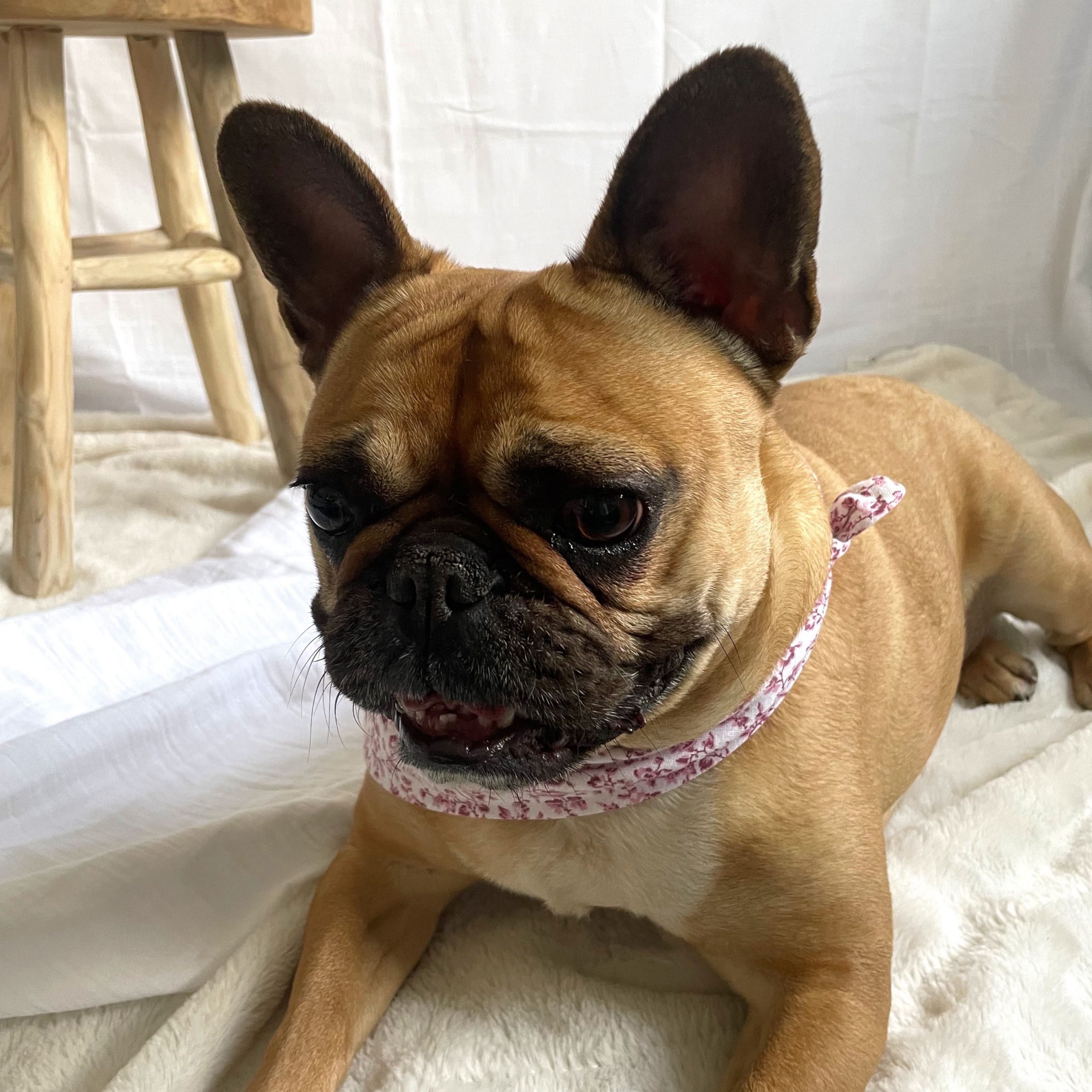 Pour information, Plume est une race bouledogue français et porte le bandana en taille M (tour de cou entre 30 et 39cm)