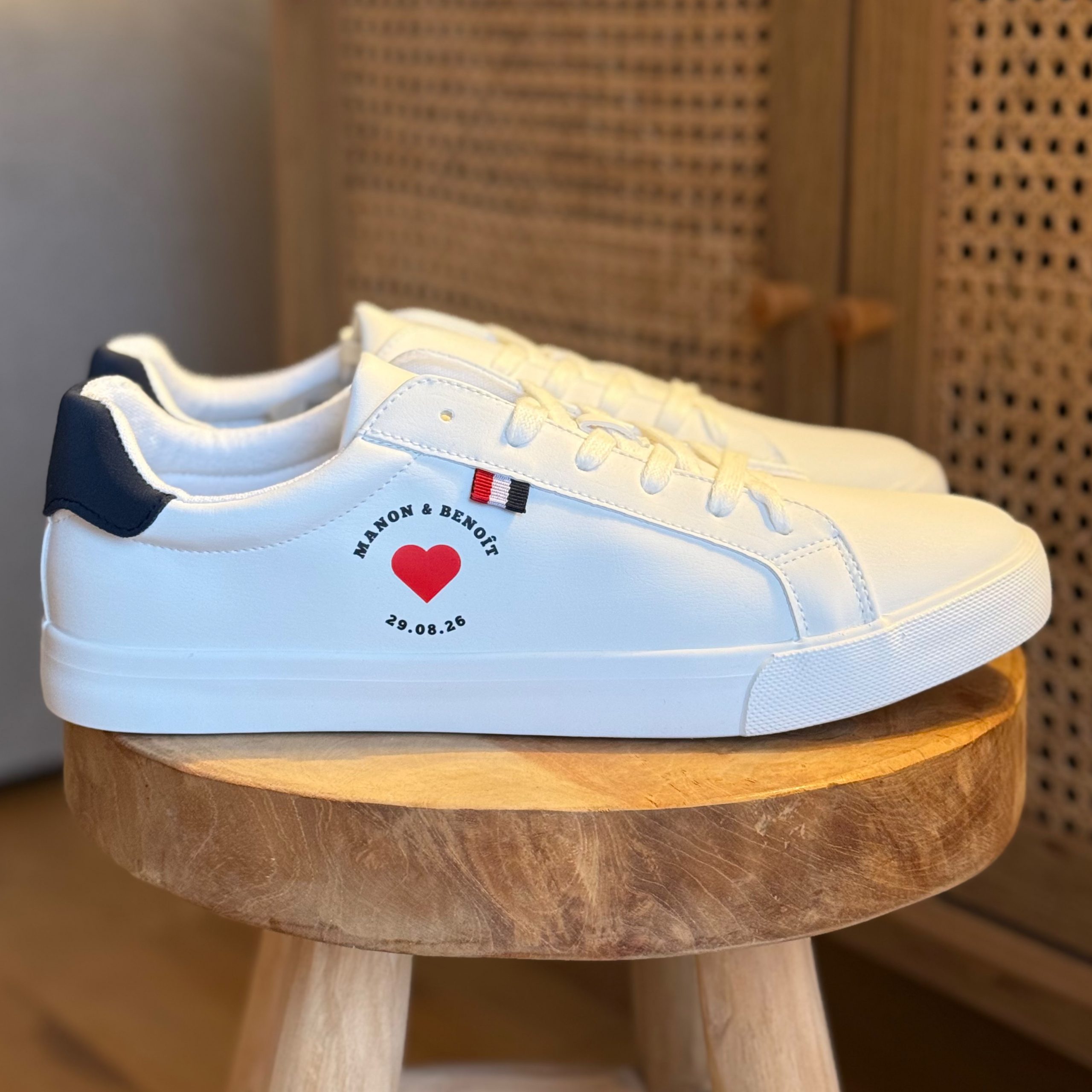 Transformez vos baskets en pièces uniques grâce à notre impression personnalisée, spécialement conçue pour les mariages. Que ce soit vos prénoms, la date du mariage, une citation ou un design exclusif, chaque détail est imprimé avec soin garantissant une résistance optimale aux frottements, à l’usure et aux intempéries.